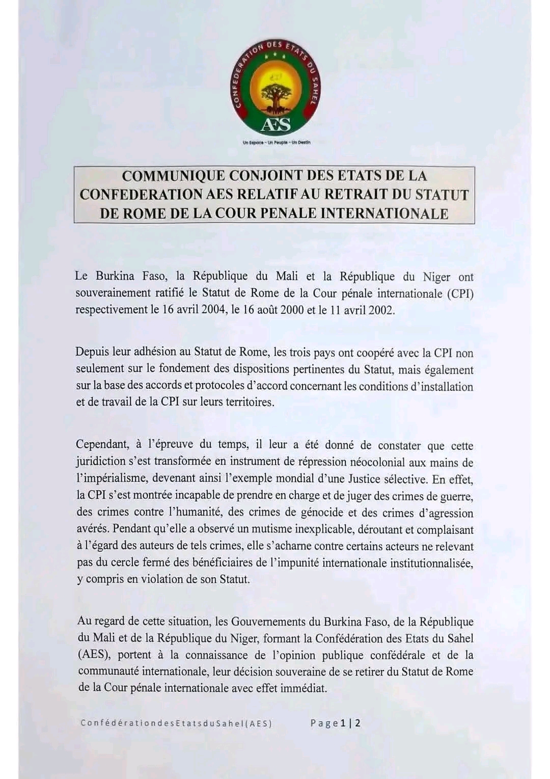 Au regard de cette situation, les Gouvernements du Burkina Faso, de la République du Mali et de la République du Niger, formant la Confédération des Etats du Sahel (AES), portent à la connaissance de l’opinion publique confédérale et de la communauté internationale, leur décision souveraine de se retirer du Statut de Rome de la Cour pénale internationale avec effet immédiat.