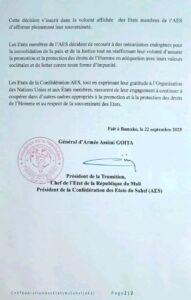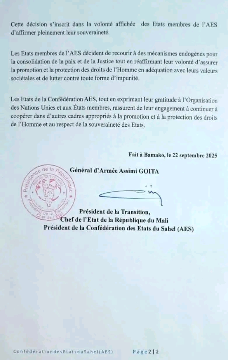 Les Etats de la Confédération AES, tout en exprimant leur gratitude à l’Organisation des Nations Unies et aux États membres, rassurent de leur engagement à continuer à coopérer dans d’autres cadres appropriés à la promotion et à la protection des droits de l’Homme et au respect de la souveraineté des Etats.
