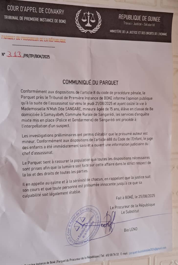 Dans ledit communiqué, le Parquet de Boké informe l’opinion publique qu’à la suite de l’assassinat ayant coûté la vie à Mademoiselle N’Mah Odé Sangaré, mineure âgée de 15 ans, les services d’enquête mixte (Police et Gendarmerie) de Sangarédi, ont procédé à l’interpellation d’un suspect.