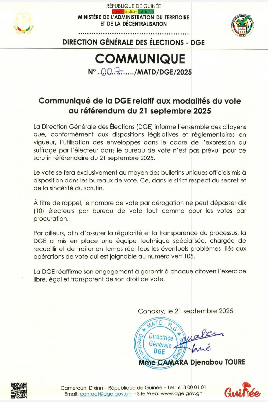 La Direction Générale des Élections (DGE) informe l’ensemble des citoyens que, conformément aux dispositions législatives et règlementaires en vigueur, l’utilisation des enveloppes dans le cadre de l’expression du suffrage par l’électeur dans le bureau de vote n’est pas prévu pour ce scrutin référendaire du 21 septembre 2025.