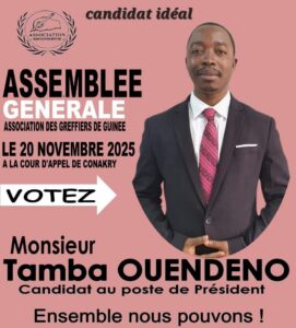 À l’occasion de l’assemblée générale élective de l’Association des Greffiers de Guinée, prévue ce 20 novembre 2025 à la Cour d’Appel de Conakry, un nom suscite un profond respect dans les rangs des professionnel novembres du greffe : celui de Tamba Ouendéno, candidat à la présidence de cette organisation. Son parcours, marqué par la persévérance, la loyauté et une détermination sans faille, fait de lui une figure emblématique du corps des greffiers guinéens.