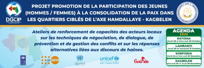 Dans le cadre de la promotion de la participation des jeunes à la consolidation de la paix la DGCIP organise dans les communes de Ratoma, Lambanyi, Sonfonia et Kagbelen des ateliers de renforcement de capacités des acteurs locaux sur les techniques de négociation, de dialogue, de prévention et de gestion des conflits et sur les réponses alternatives liées aux discours de haines du 28 octobre au 06 novembre 2025.