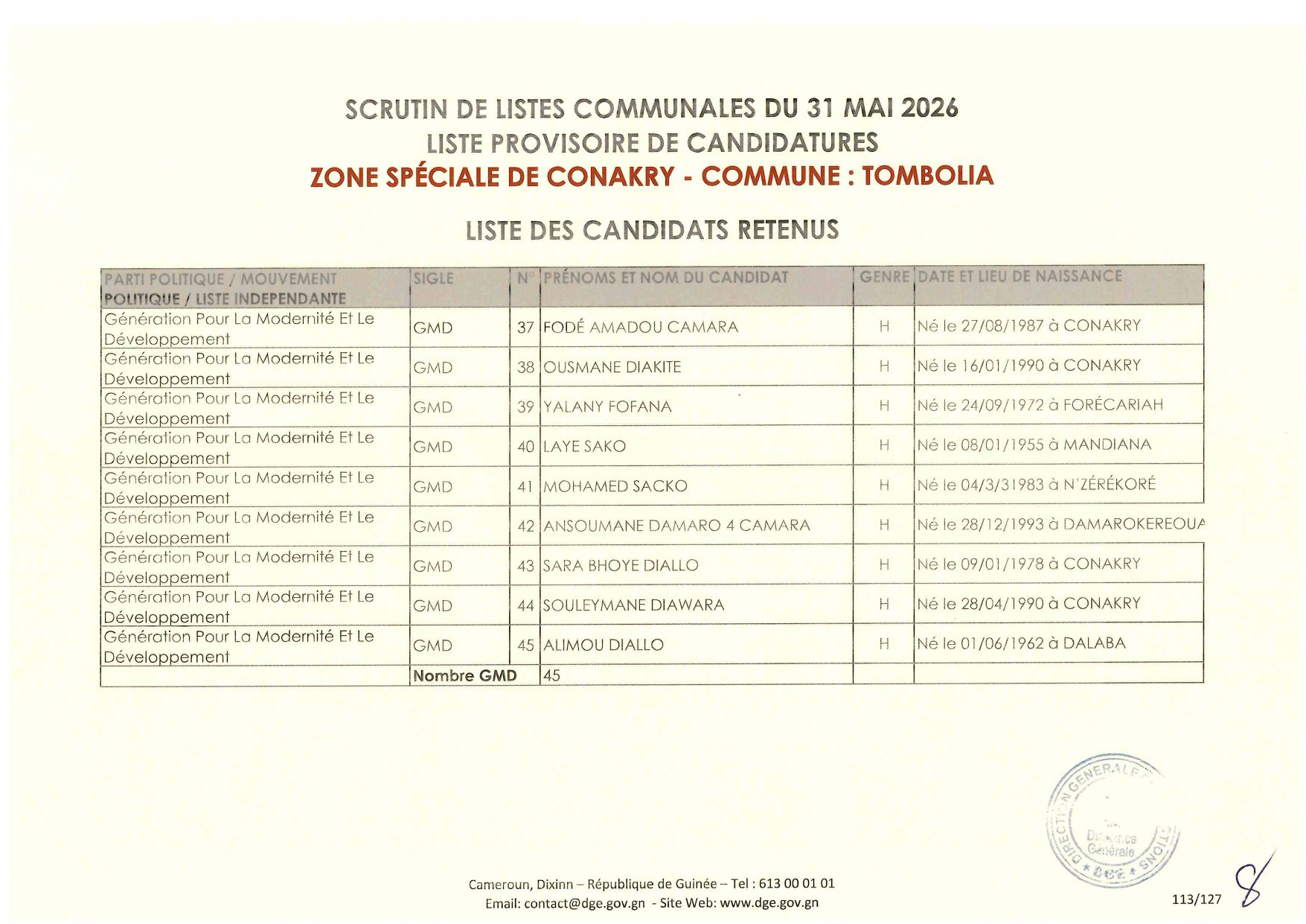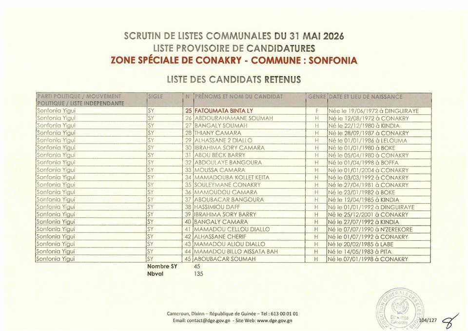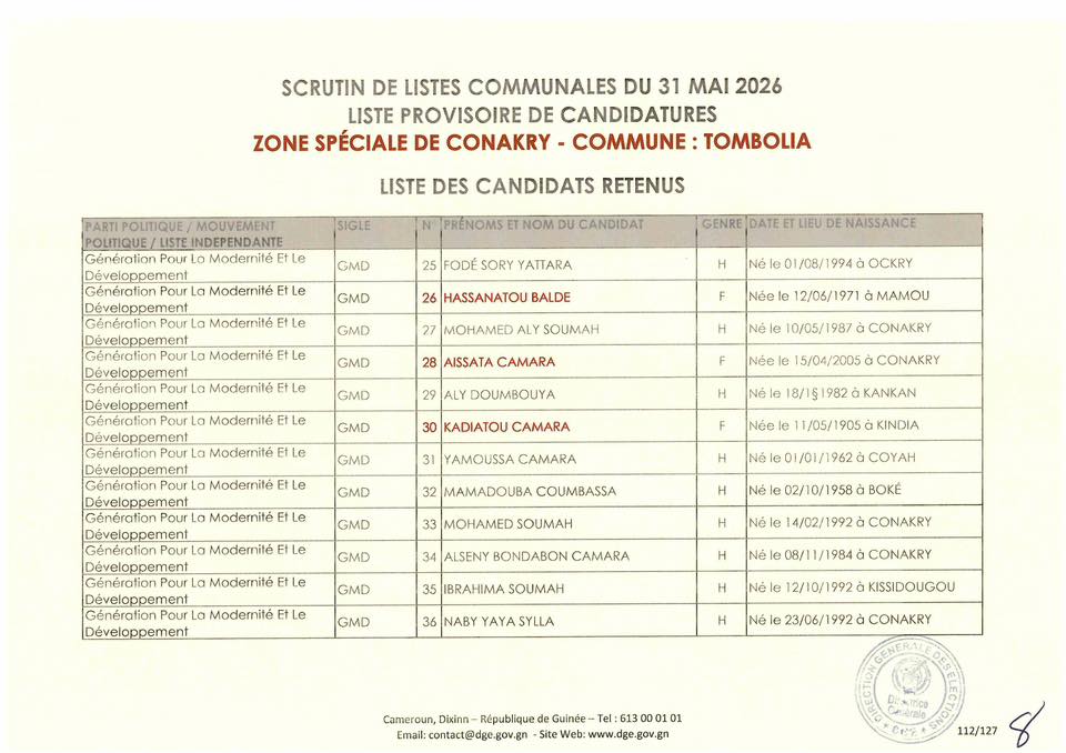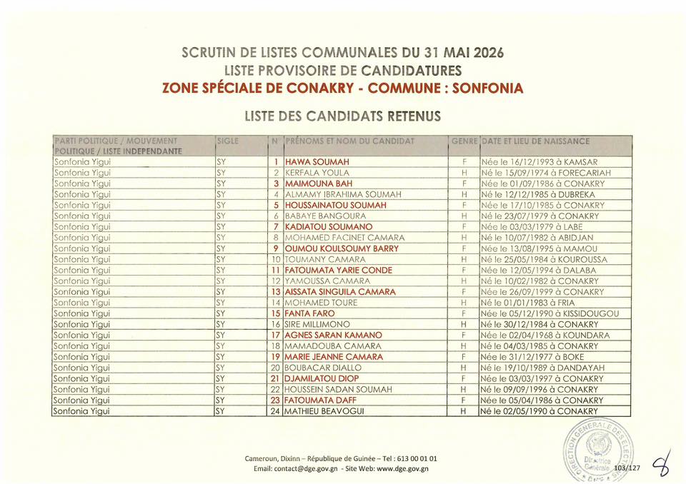 La Direction Générale des Élections (DGE) a franchi une étape majeure dans le processus électoral en rendant publique, le 22 avril 2026, la liste provisoire des candidatures pour les élections communales prévues le 31 mai prochain dans la région spéciale de Conakry.