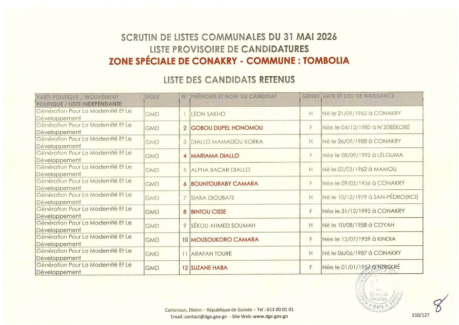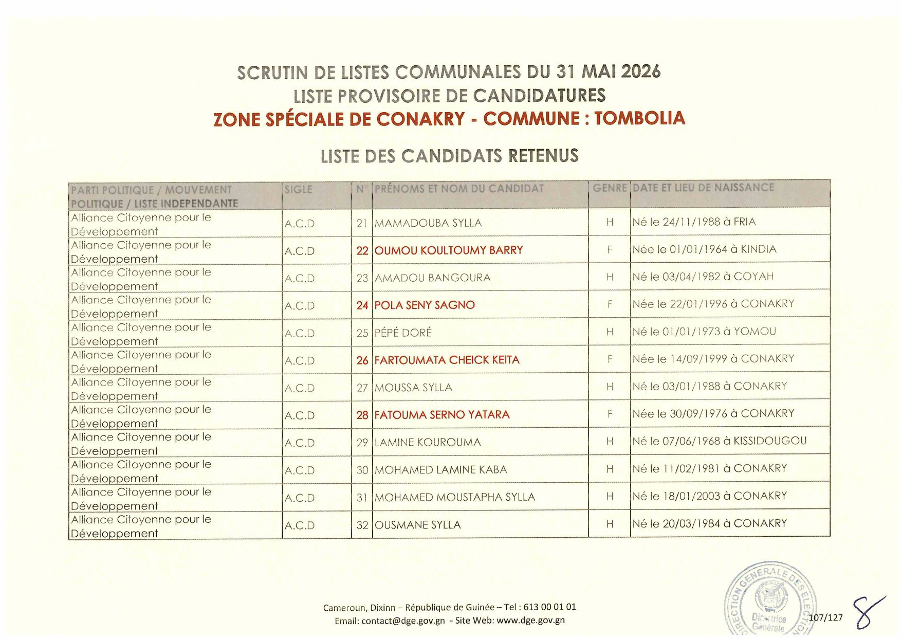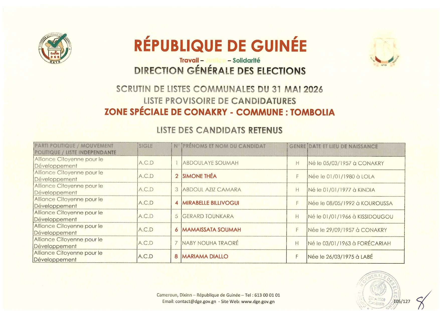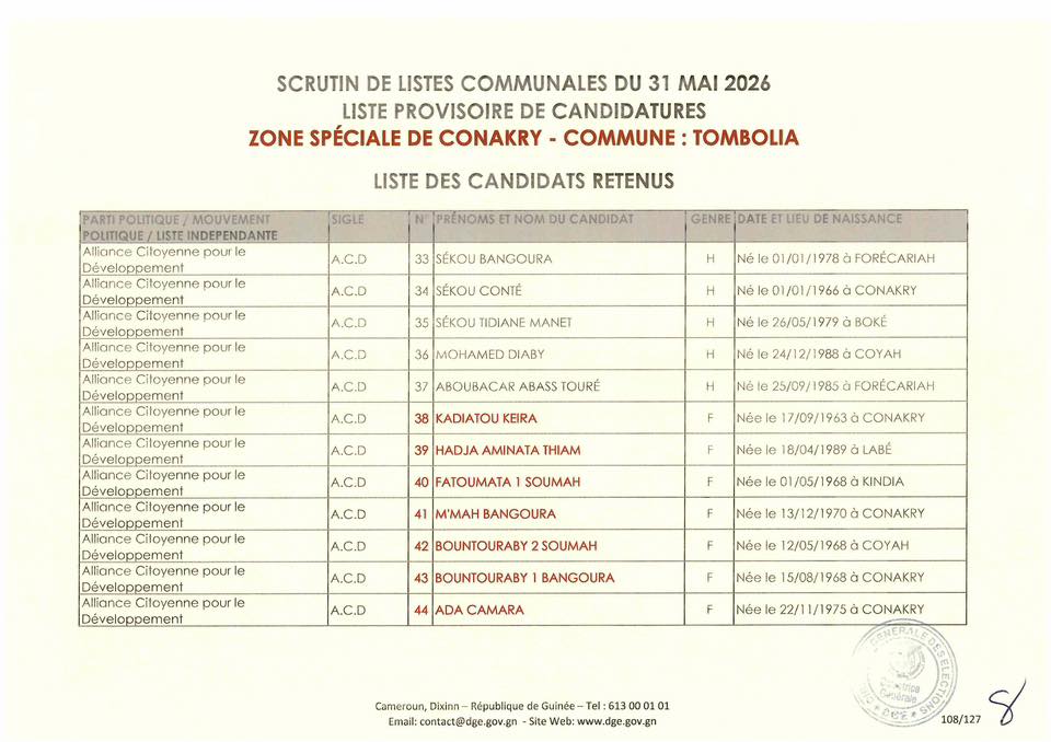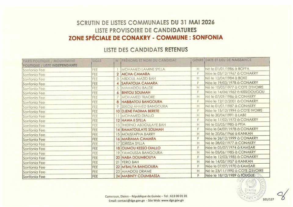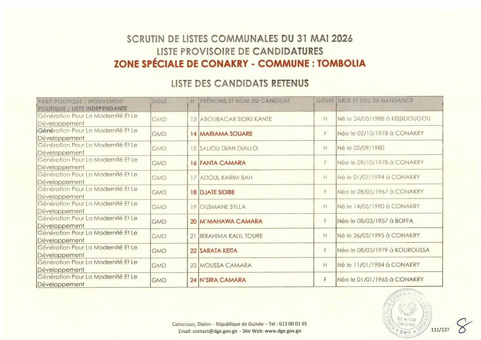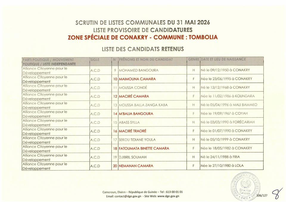 C’est à travers la décision D/2026/054/MATD/DGE que Djénabou Touré, Directrice générale des Élections, a validé les listes retenues pour ce scrutin de liste à la représentation proportionnelle.