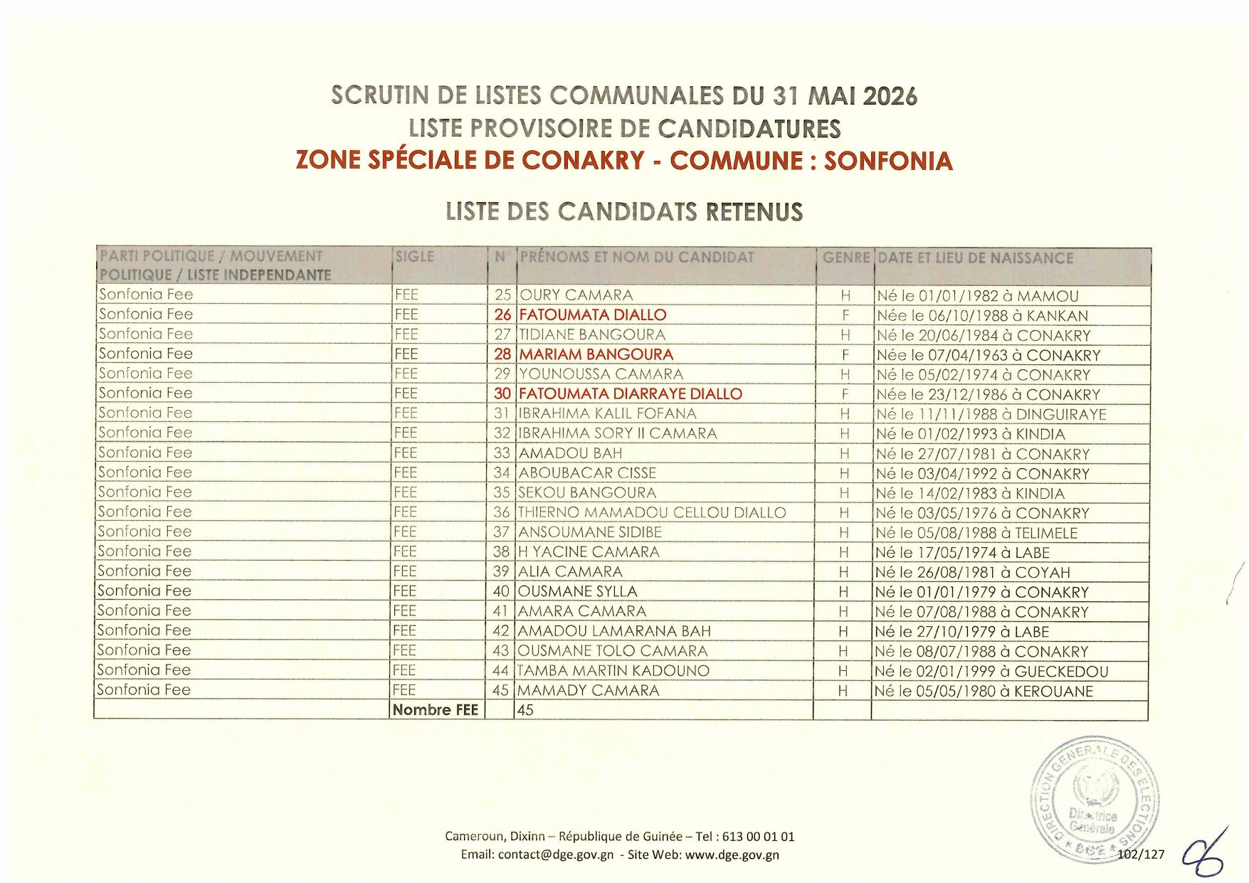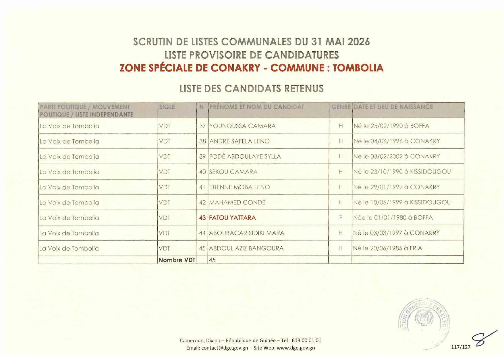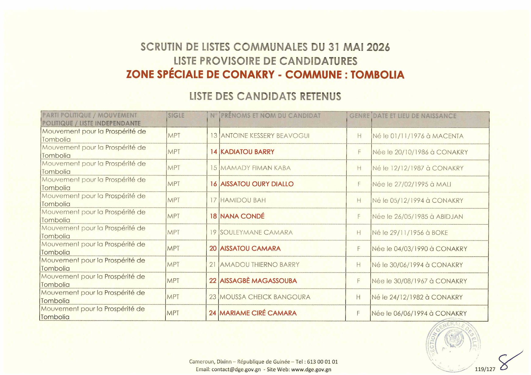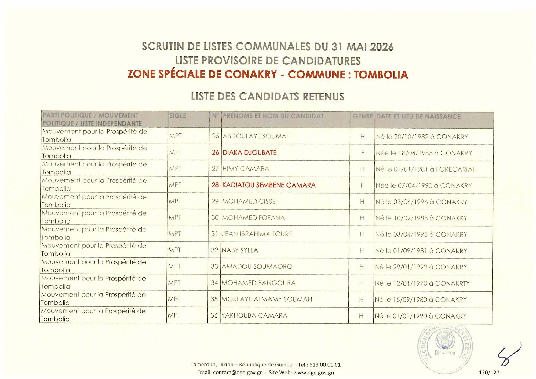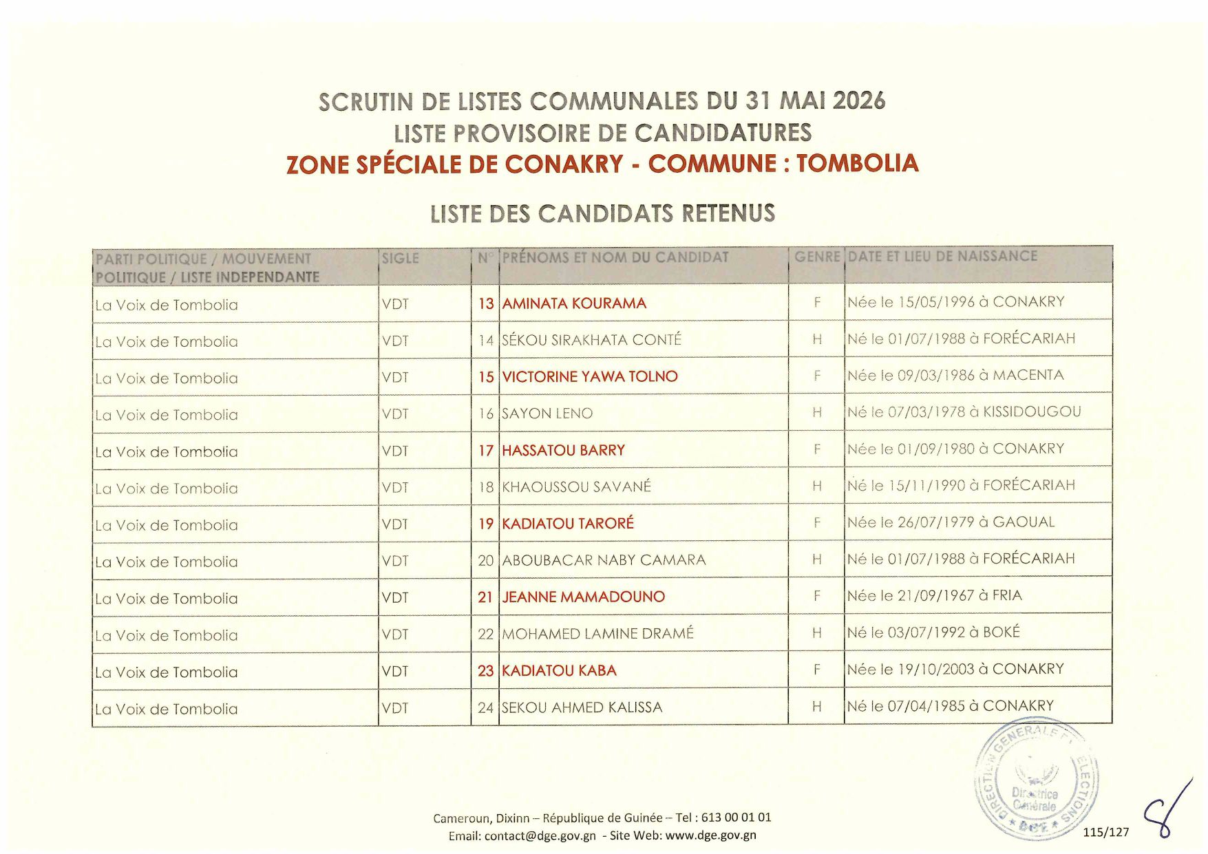 C’est à travers la décision D/2026/054/MATD/DGE que Djénabou Touré, Directrice générale des Élections, a validé les listes retenues pour ce scrutin de liste à la représentation proportionnelle.