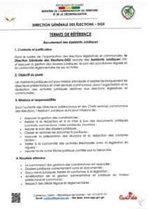 Ce recrutement s’inscrit dans une dynamique de consolidation de la transparence, de la conformité légale et de l’efficacité des opérations électorales, tant au niveau préfectoral que communal. Les Assistants juridiques auront pour mission principale d’apporter un appui technique aux Directeurs préfectoraux et aux Chefs de services communaux des élections, notamment dans la gestion des dossiers juridiques et le suivi des procédures légales.