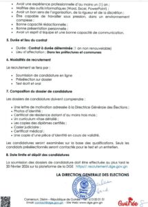 Ces agents seront également chargés de l’installation, de la configuration et de la maintenance des équipements informatiques (ordinateurs, imprimantes, serveurs et réseaux), du support technique, de la mise à jour des logiciels, ainsi que de l’appui à l’organisation des formations des agents électoraux. La rédaction de rapports techniques périodiques figure aussi parmi leurs responsabilités.