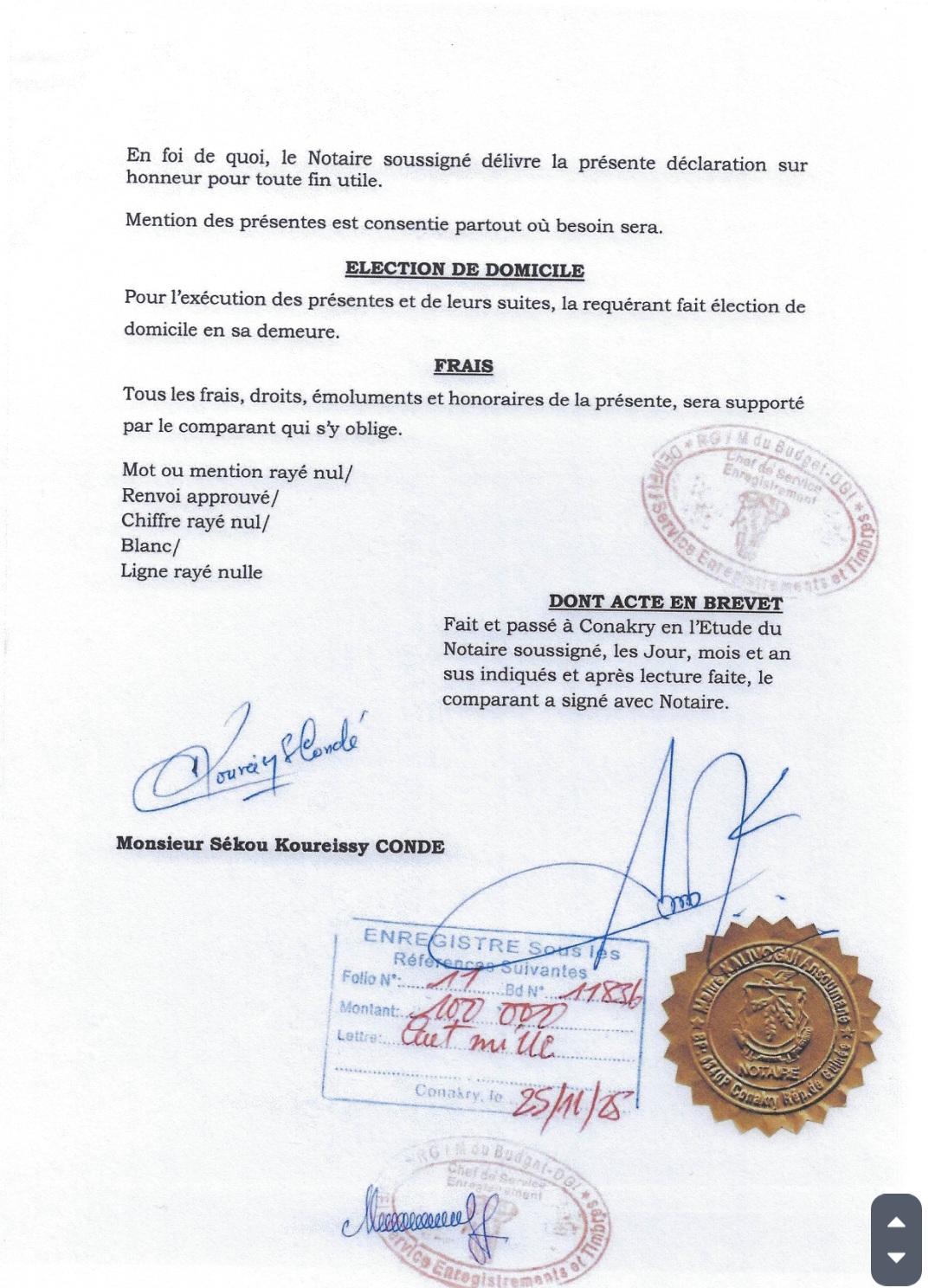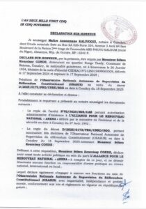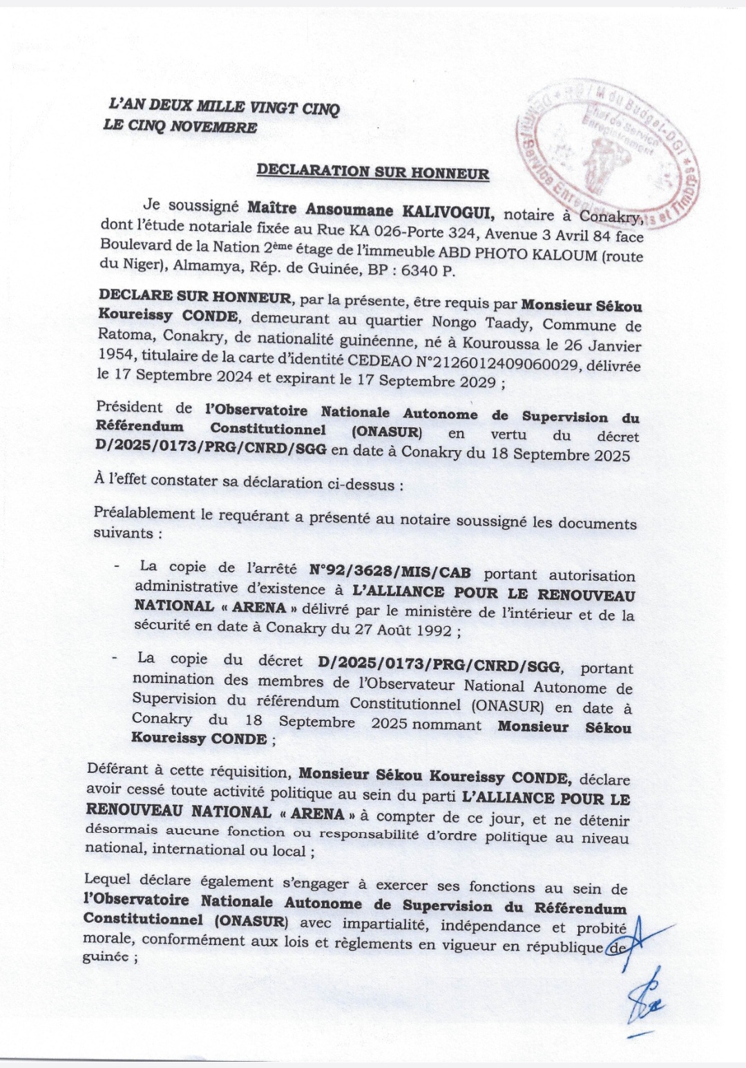 Ce retrait, qui se veut un modèle d’engagement citoyen et démocratique, est formalisé par une déclaration sur l’honneur mise à la disposition de notre rédaction ce vendredi 28 novembre 2025. Le document, établi chez Maître Ansoumane Kalivogui, notaire à Conakry, est sans équivoque et souligne la nécessité de l’impartialité pour sa nouvelle fonction.