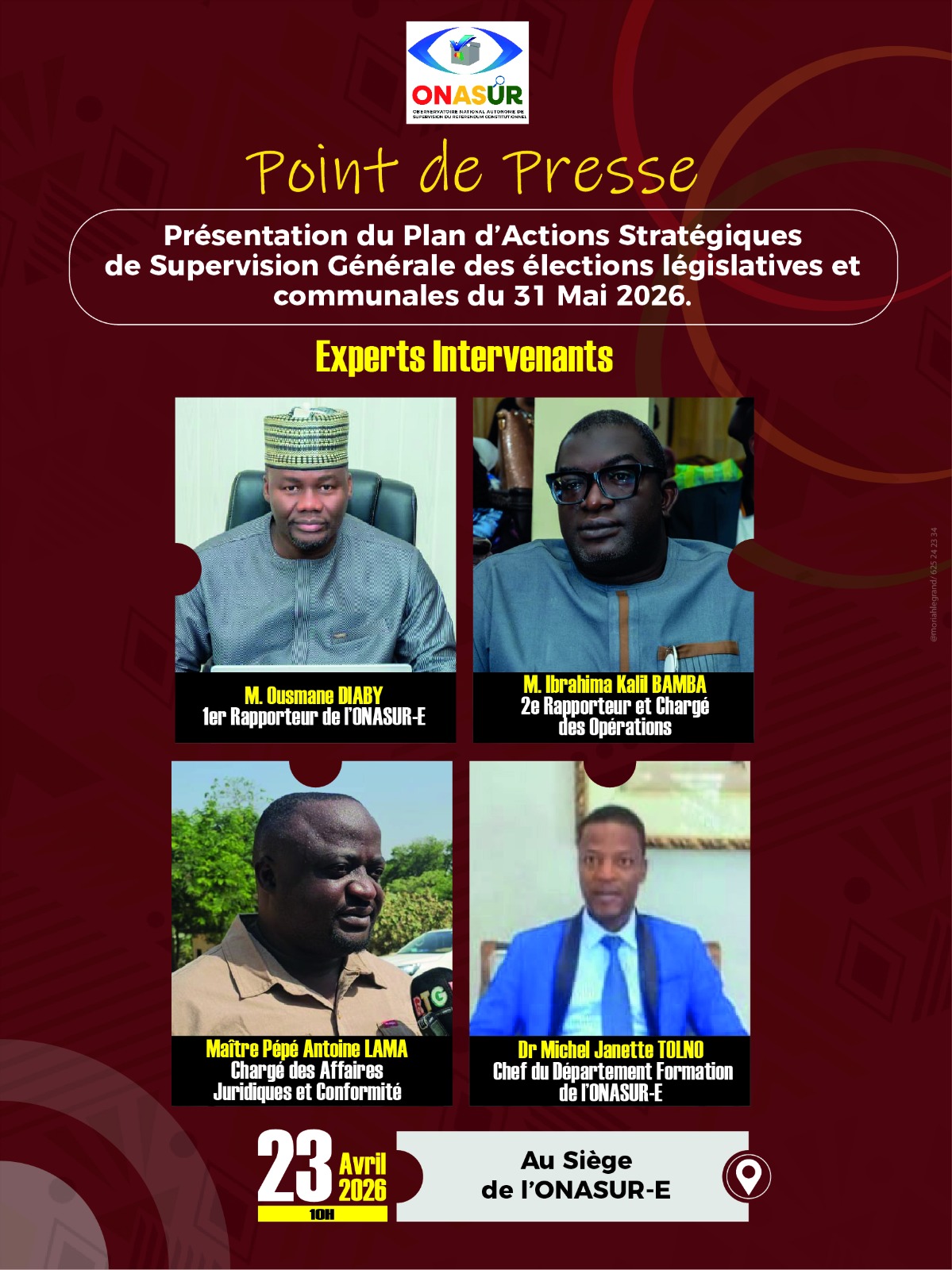 Dans le cadre des préparatifs des élections législatives et communales prévues le 31 mai 2026, l’Observatoire National Autonome de Supervision du Référendum Constitutionnel et des Élections (ONASUR-E) organise un point de presse le 23 avril 2026 à 10 heures, à son siège.