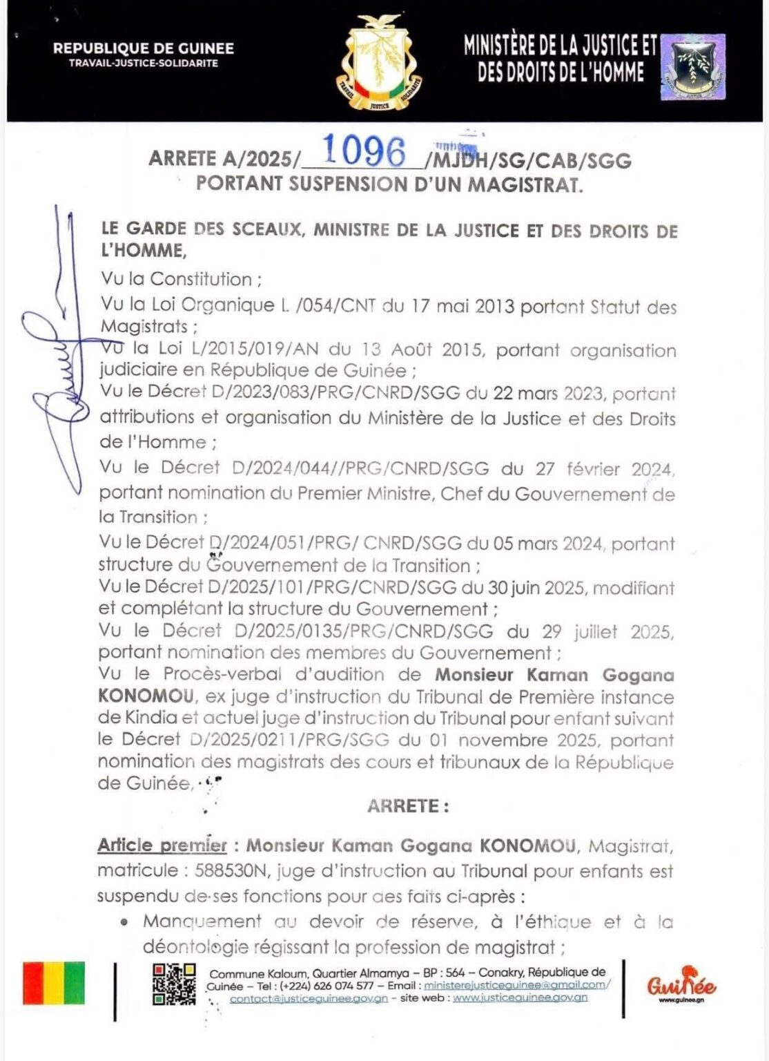 À travers un arrêté dont copie a été consultée ppar Leperroquetguinee.com, le garde des Sceaux, ministre de la Justice et des Droits de l’Homme, Yaya Kaïraba Kaba, a prononcé la suspension du magistrat Kaman Gogana Konomou, matricule 588530N, juge d’instruction au Tribunal pour enfants.