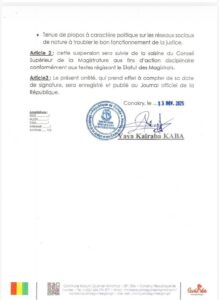L’article 2 de l’arrêté précise que cette suspension sera suivie de la saisine du Conseil supérieur de la magistrature aux fins d’une action disciplinaire, conformément aux textes en vigueur sur le statut des magistrats.