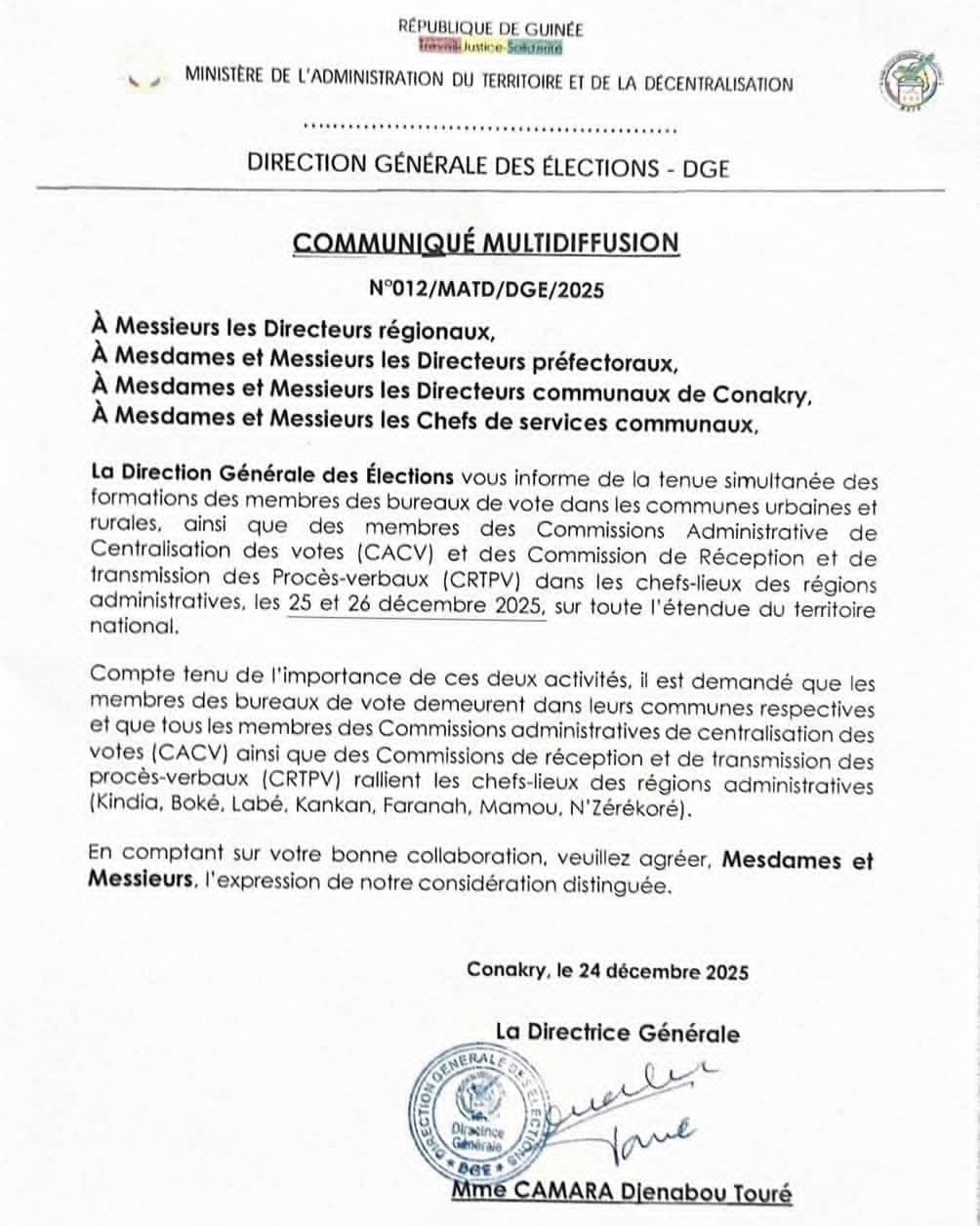 À travers un communiqué dont nous a été transmis ce jeudi 24 décembre 2025, la Direction Générale des Élections (DGE) informe les directeurs régionaux, préfectoraux et communaux de Conakry, ainsi que les chefs de services communaux, de la tenue simultanée des formations des membres des bureaux de vote, des Commissions Administratives de Centralisation des Votes (CACV) et des Commissions de Réception et de Transmission des Procès-Verbaux (CRTPV).