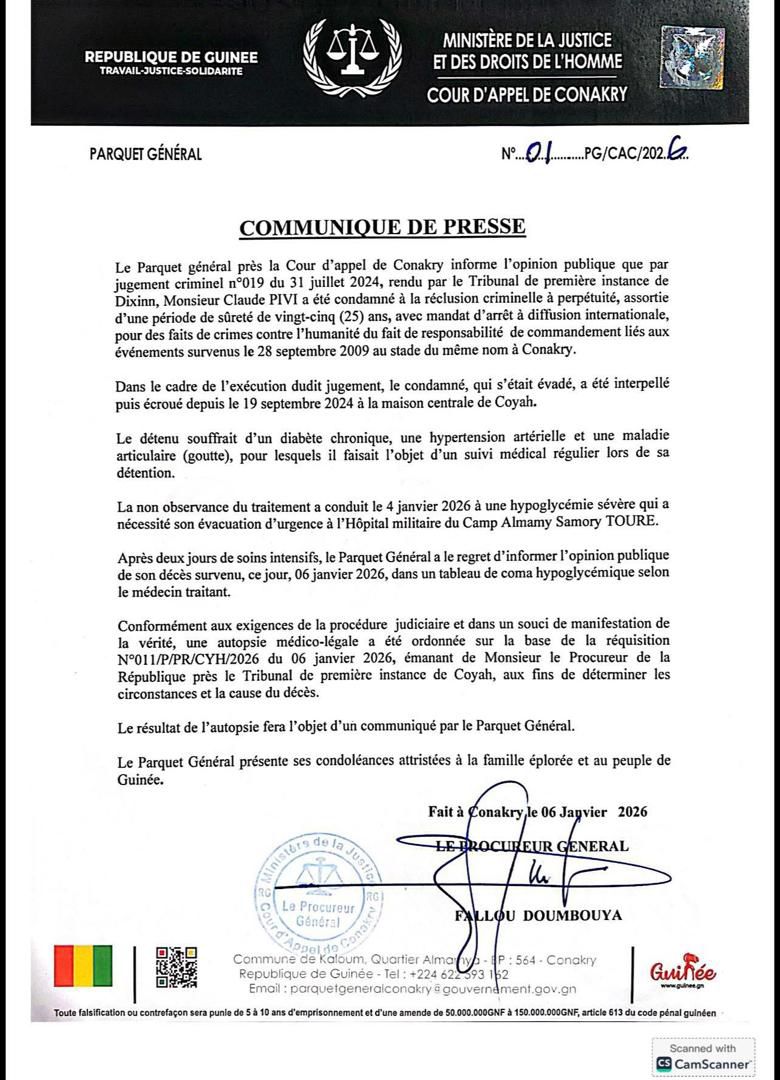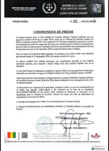 Le résultat de l’autopsie fera l’objet d’un communiqué par le Parquet Général. Le Parquet Général présente ses condoléances attristées à la famille éplorée et au peuple de Guinée.