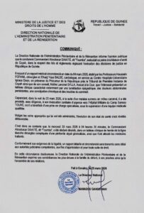 Selon le communiqué, le condamné purgeait sa peine à la Maison d’arrêt de Coyah, dans le strict respect des lois et règlements en vigueur en République de Guinée relatifs à l’exécution des décisions de justice.
