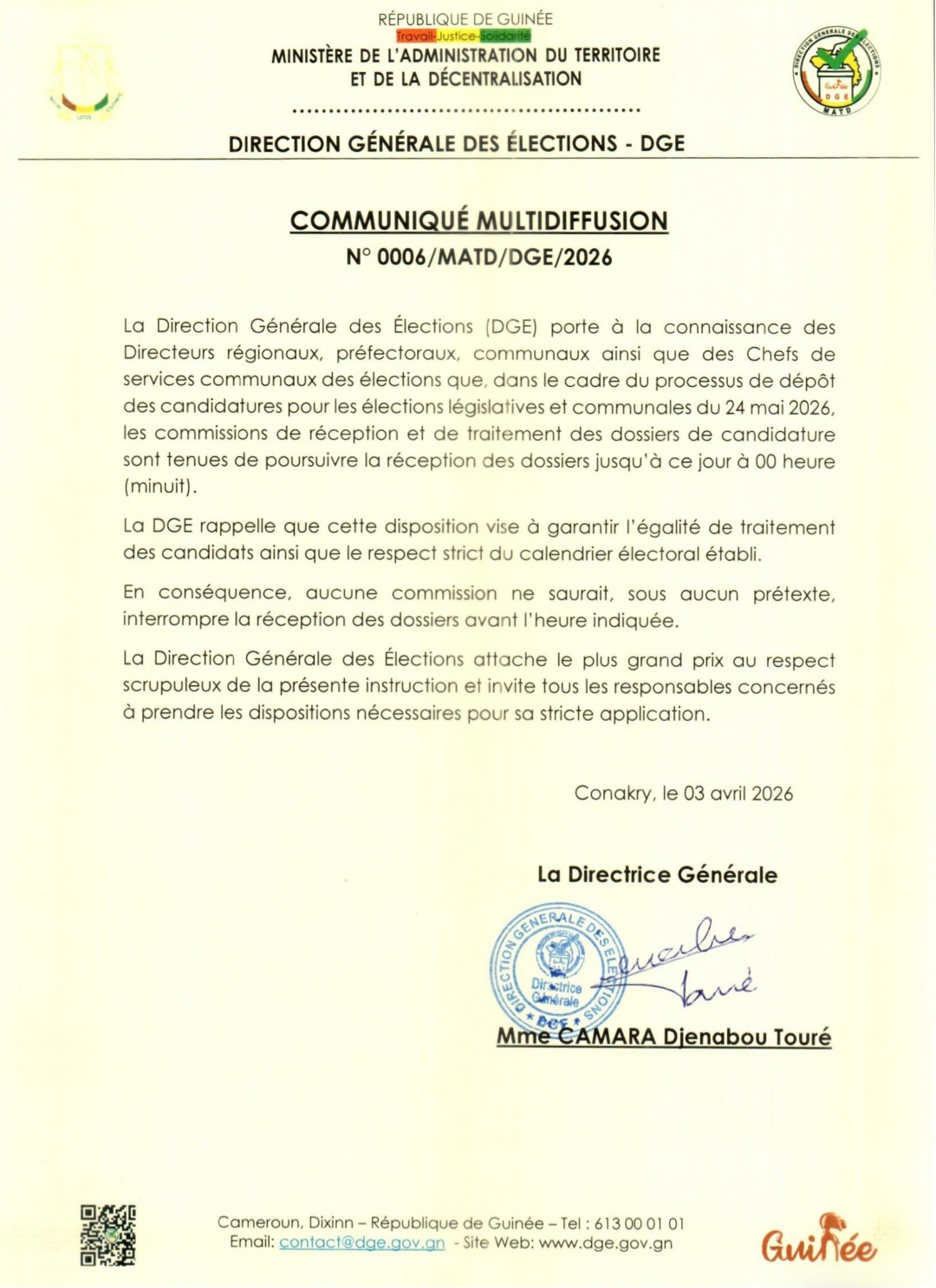 Conakry, 3 avril 2026 — Dans un communiqué multidiffusion publié ce vendredi, la Direction Générale des Élections (DGE) a annoncé la poursuite exceptionnelle de la réception des dossiers de candidature pour les élections législatives et communales prévues le 24 mai 2026, jusqu’à 00 heure (minuit).