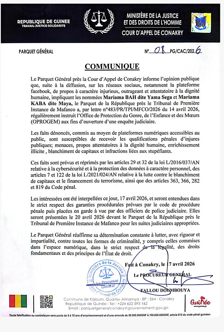 Selon les autorités judiciaires, les faits impliquent deux femmes identifiées comme Mariama Bah, connue sous le nom de Yama Sega, et Mariama Kaba, alias Maya. Face à la gravité des accusations, le Parquet de la République près le Tribunal de Première Instance de Mafanco a saisi, par correspondance en date du 14 avril 2026, l’Office de Protection du Genre, de l’Enfance et des Mœurs (OPROGEM) afin de diligenter une enquête.
