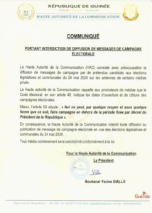 Conakry — La Haute Autorité de la Communication (HAC) a annoncé, dans un communiqué officiel, l’interdiction formelle de toute diffusion ou publication de messages de campagne électorale en dehors de la période légalement fixée, à l’approche des élections législatives et communales prévues le 24 mai 2026.