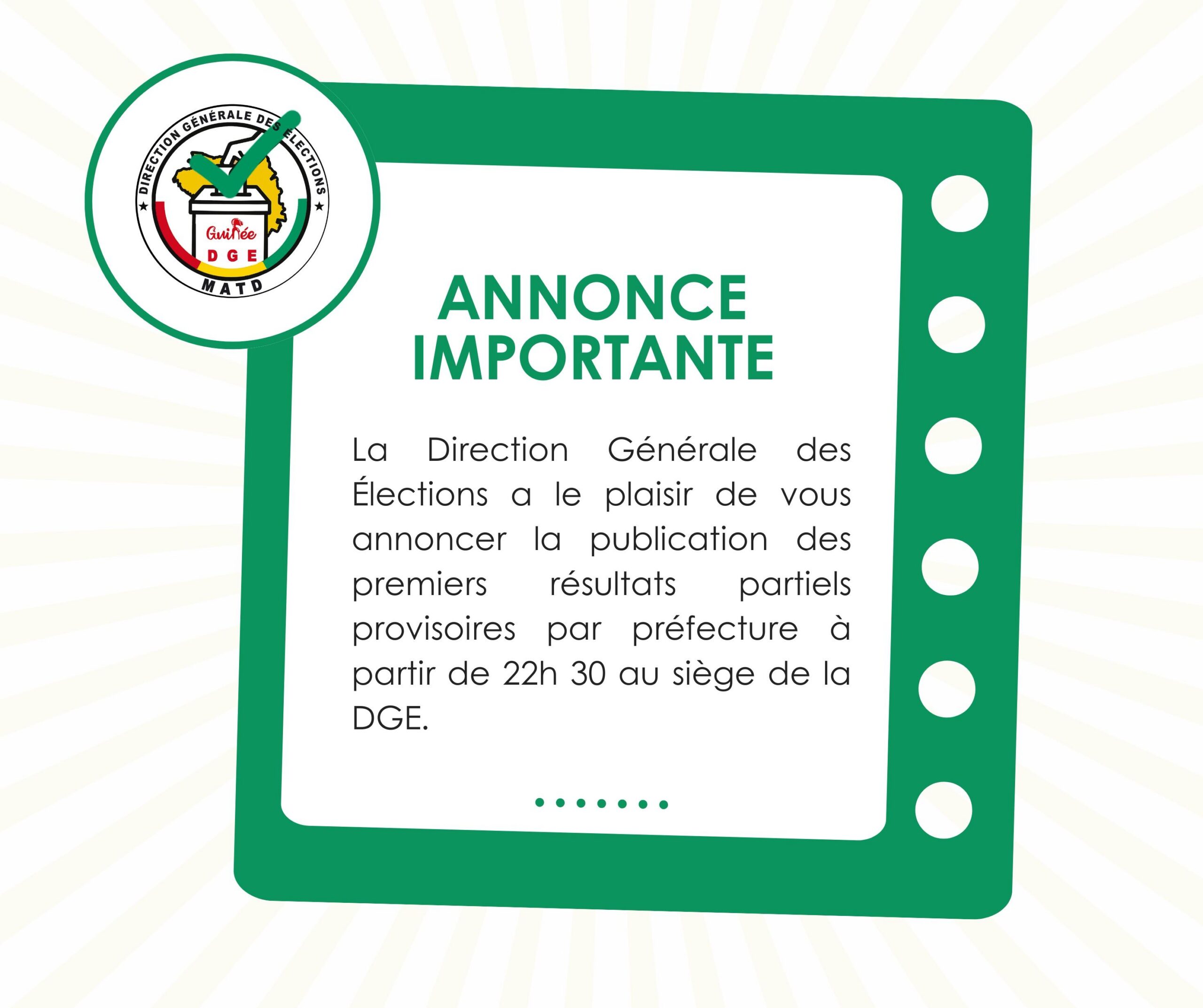 Urgent : présidentielle 2025, les résultats provisoires est prévue à 22h 30mn( DGE ) Par Directeur de Publication - 29 décembre 2025 8308 La Direction Générale des Élections a le plaisir de vous annoncer la publication des premiers résultats partiels provisoires par préfecture à partir de 22h 30 au siège de la DGE.